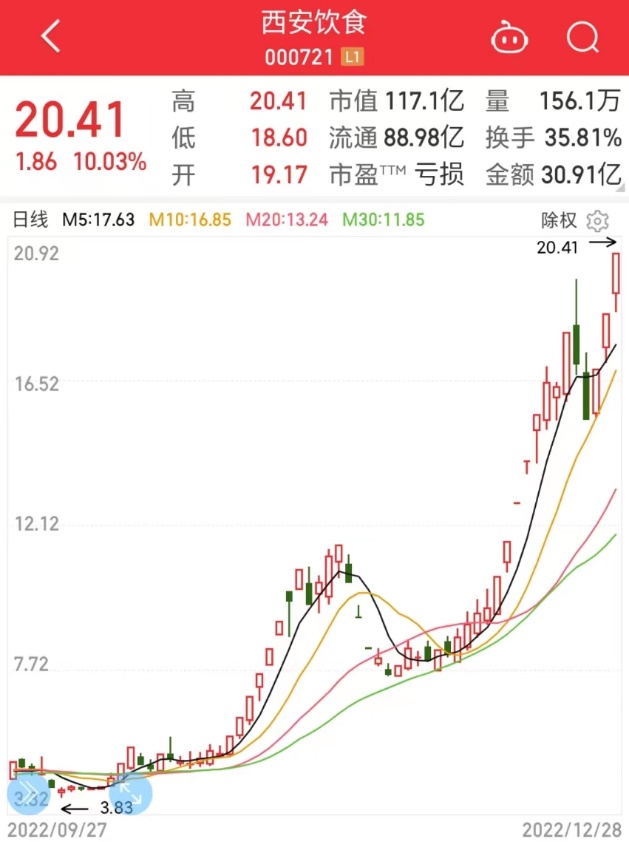 市场本以为西安饮食的强势走势会逐步消退殆尽,但它的股价却迎来了第二轮大涨。本次大涨,更多得益于疫情防控政策放开对于旅游餐饮板块的利好,公司股票良好的炒作特质也继续被游资盯上,12月12日起,西安饮食一周收获5个涨停,26日-28日再次获得三连板,股价也成功来到20元上方。经历两轮暴涨,公司市值由10月份最低的23.41亿元猛增至117.14亿元。