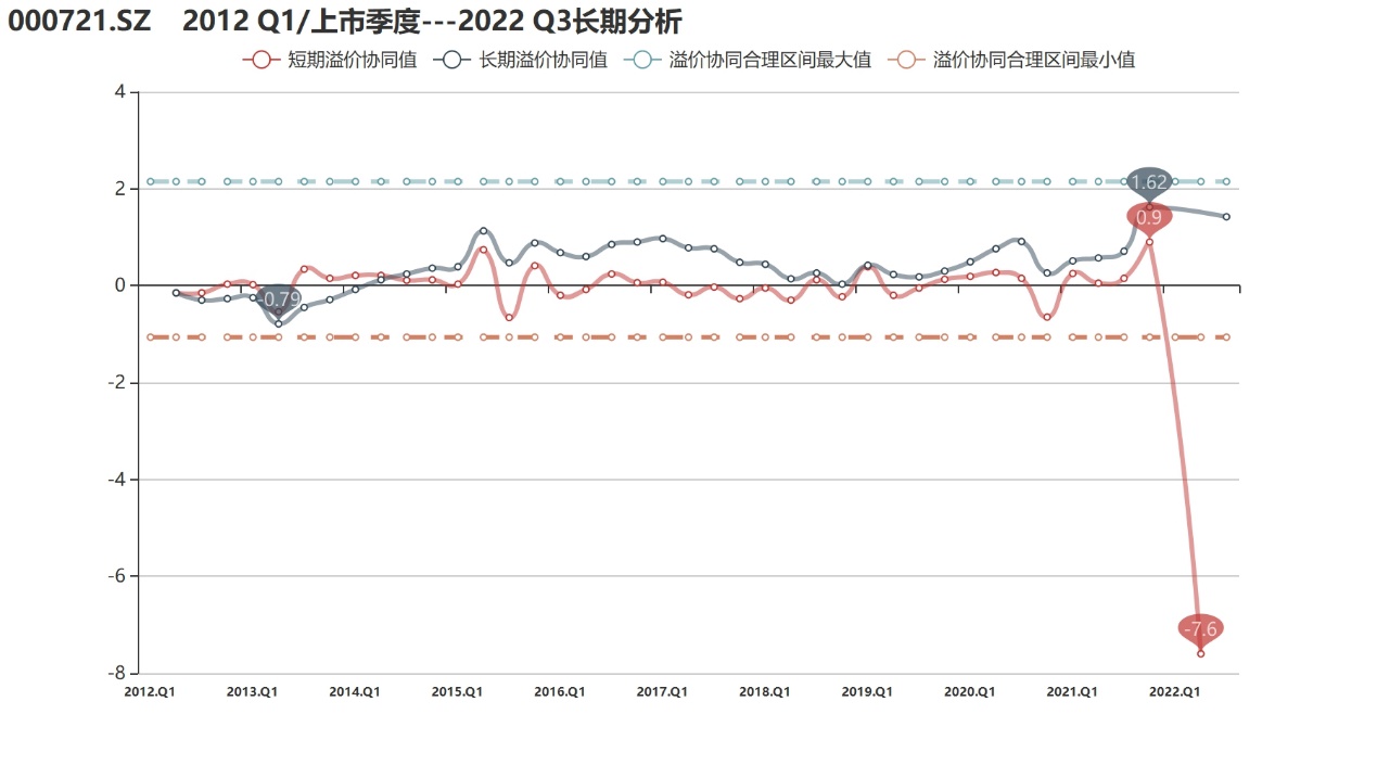 溢价协同值:截至2022年3季度,公司长期溢价协同值为1.42。由于公司近几个季度经营状况恶化严重,个别季度的长期和短期溢价协同水平已无法准确衡量。总体来看,自2015年以来,西安饮食的长期溢价协同始终位于正合理区间,表明市场愿意在公司内在价值低位运行时持续给予其一定溢价。显然在3季度的基础上,经过两个月来的行情催化,西安饮食的最新估值已严重偏高,市场给予了公司非理性溢价。
