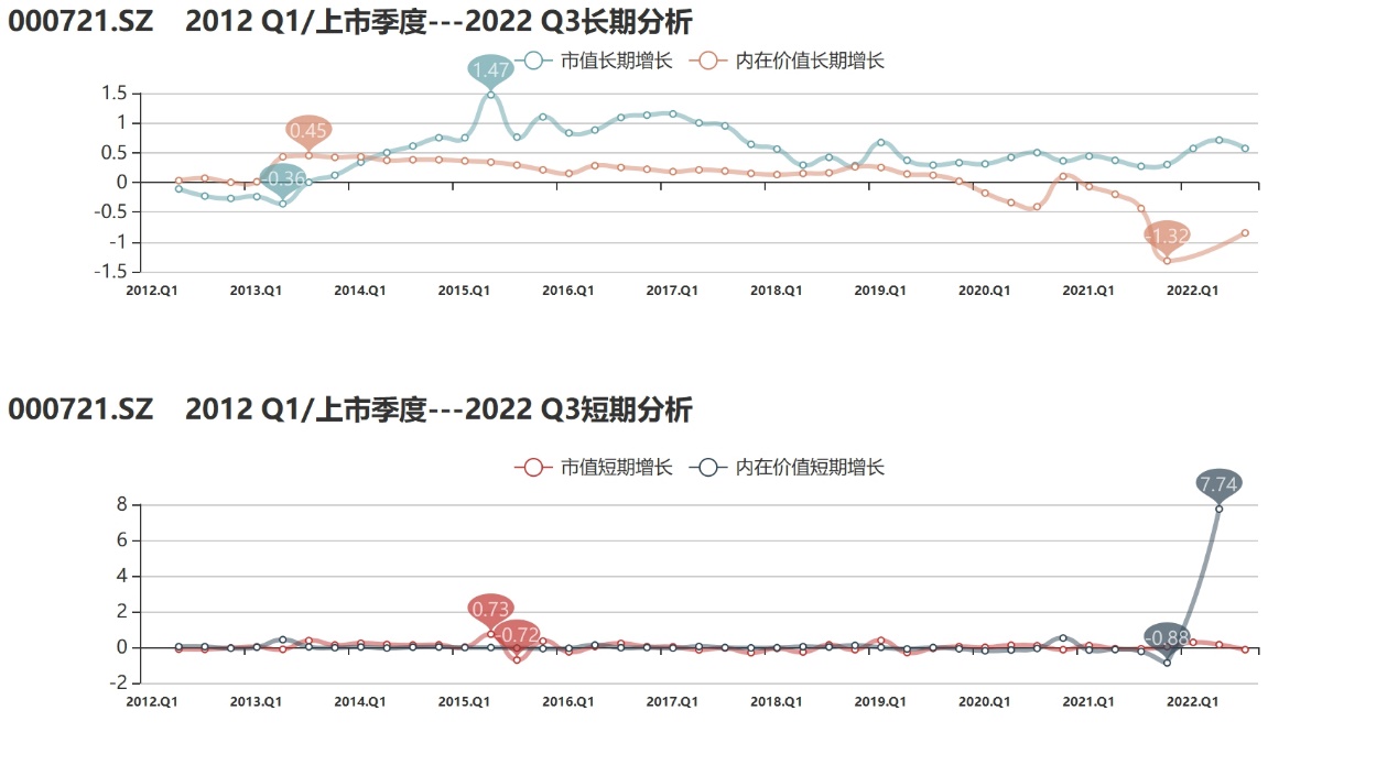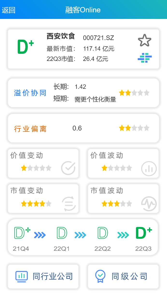 通过【融客Online】小程序对西安饮食打分初步发现,截止到2022年3季度,公司评级为D+,健康水平很差。近十年来公司市值累计上涨但内在价值出现下跌,两者匹配程度不佳。