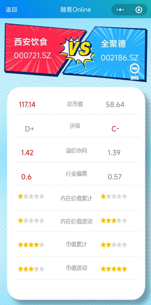 今年3季度末,两家公司的市值均在不到30亿的水平,但经过“更胜一筹”的炒作过后,西安饮食的市值已是全聚德的两倍。评级和溢价协同表现上,两家公司也是半斤八两,全聚德的市值表现没能像西安饮食那般坚挺,累计出现一定幅度下跌,但均大幅好于各自拉胯的价值端。