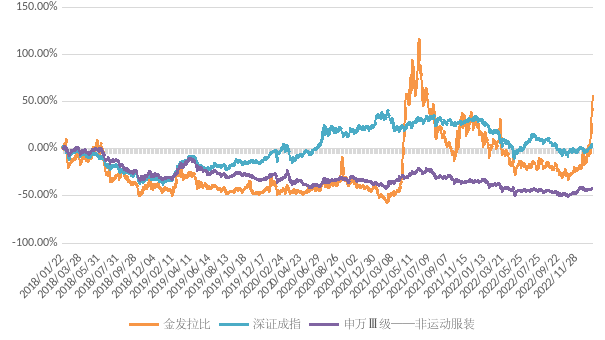 聚焦金发拉比近五年的市值表现。在整个纺织和服装产业几年来表现萧条的背景下,非运动服装行业指数走势低迷,表现明显不及大盘,而金发拉比作为其中专注母婴市场的一角,此前长期保持着与行业相同的涨跌节奏。