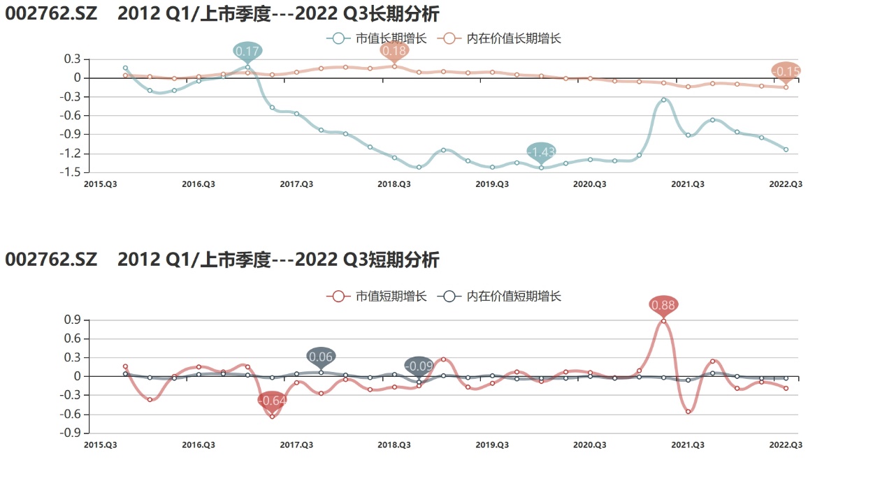 价值端方面:金发拉比的价值变动和价值波动分别为2星和5星,表明公司近七年间内在价值原地踏步,2018年3季度达到上市以来高点后缓慢滑坡,到2022年3季度创下内在价值新低,公司生产经营颓势尽显。