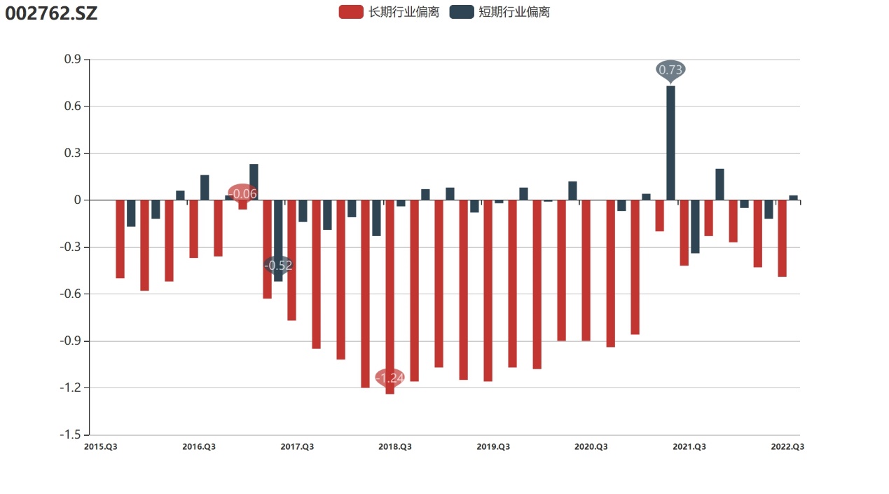 行业偏离:截至2022年3季度,金发拉比的行业偏离值为-0.49,表明公司长期溢价协同表现不及行业平均水平。多数时期,金发拉比难改自己的“小透明”形象,在资本市场上存在感颇低,溢价协同在同行业的比较中也明显落后。