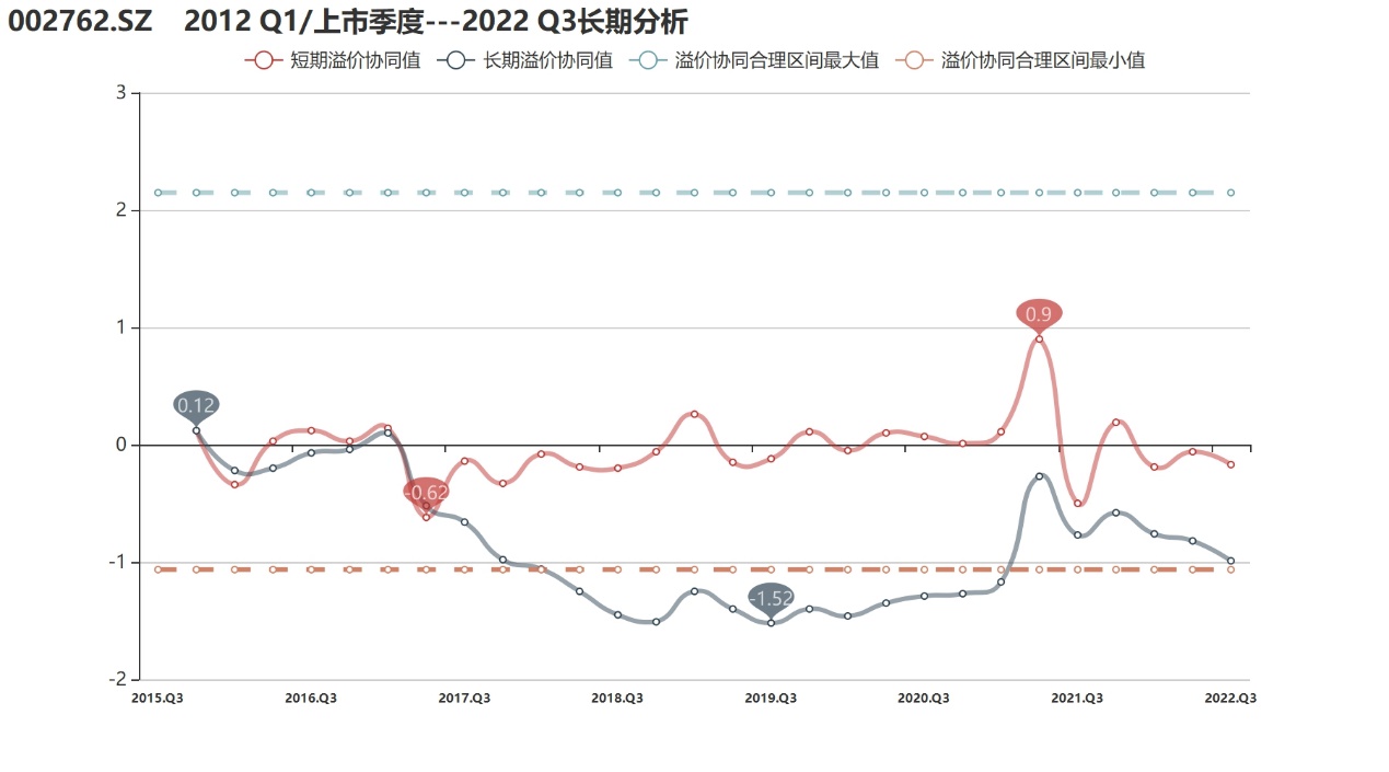 溢价协同值:截至2022年3季度,金发拉比长期溢价协同值为-0.99,短期值为-0.17,长期溢价协同已接近合理区间下边界,并仍呈下滑趋势。过往来看,公司溢价协同长期偏低,曾连续3年位于合理区间之下。2021年初受益于市场炒作,公司溢价协同明显回升,但近几个季度公司表现再度萎靡,二次探底不容乐观。