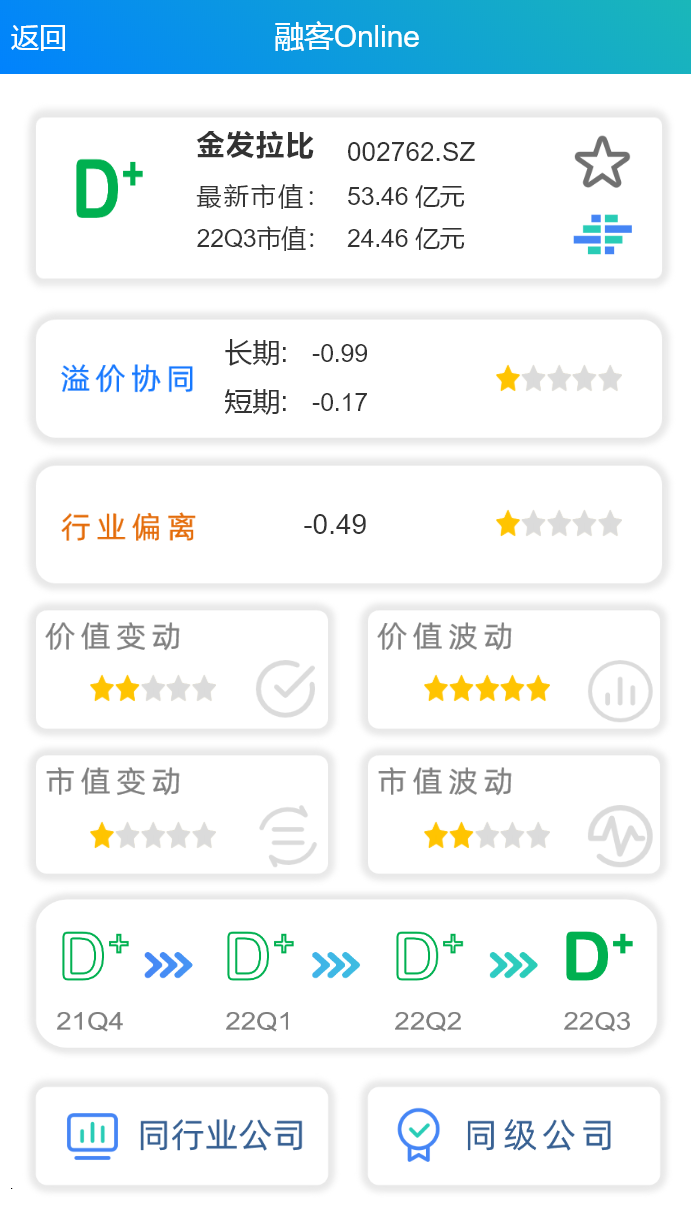 通过【融客Online】小程序对金发拉比打分初步发现,截止到2022年3季度,公司评级为D+,健康水平很差。2015年上市以来,金发拉比的市值和内在价值双双下跌,且市值未能体现内在价值变动,市场对公司的预期较差。