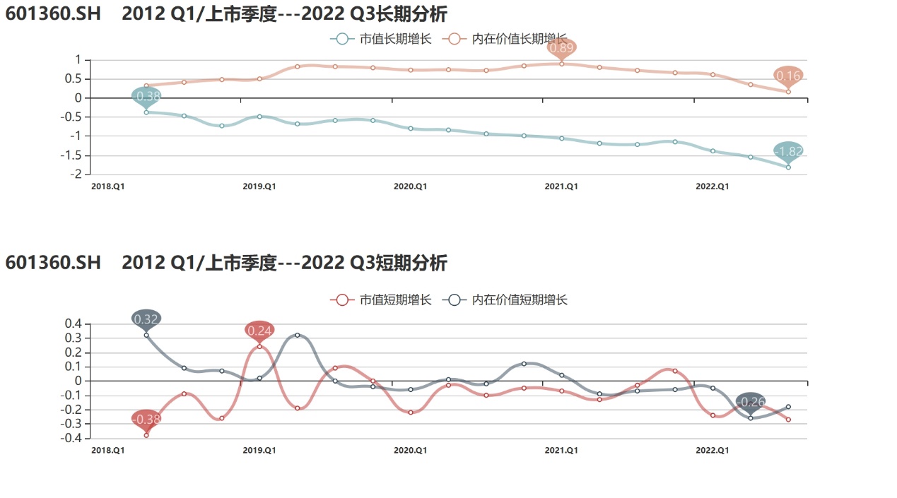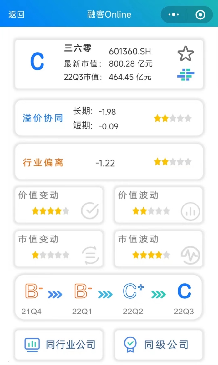 通过【融客Online】小程序对三六零打分初步发现,截止到2022年3季度,公司评级为C,健康水平较差。上市四年来,三六零的内在价值上涨但市值累计下跌,市值没能较好体现其内在价值。