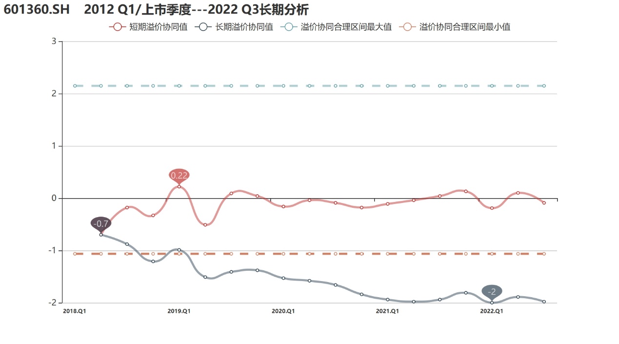 溢价协同值:自2017年底借壳回归A股以来,三六零的溢价协同表现迅速走低,截至2022年3季度,三六零长期溢价协同值为-1.98,短期值为-0.09,长期水平与合理区间已相去甚远,公司在互联网行业及资本市场中的分量已远不及当初,还需尽快从公司战略、商业模式等方面入手重新赢回市场青睐。