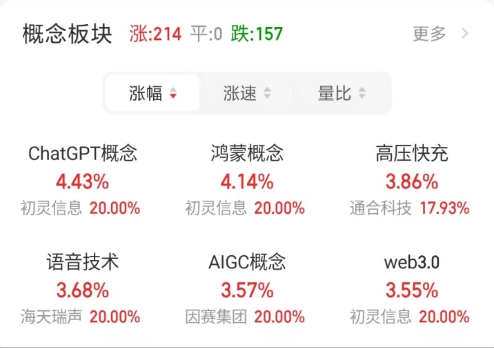春节后,ChatGPT热度席卷全球,同时在A股掀起了一股“狂飙”热潮,人工智能相关概念持续占据热门前列。此前,我们关注了布局AIGC领域已久的ChatGPT概念龙头汉王科技,并对ChatGPT及AIGC有了一定了解。两周过去,ChatGPT的热度依旧不减,特别是在周三大盘调整的背景下,ChatGPT相关概念股逆市大涨,海天瑞声、初灵信息、梦网科技、神州数码、东港股份、三六零、鸿博股份等7只个股涨停,ChatGPT概念板块则以超过4%的涨幅高居涨幅榜首位。