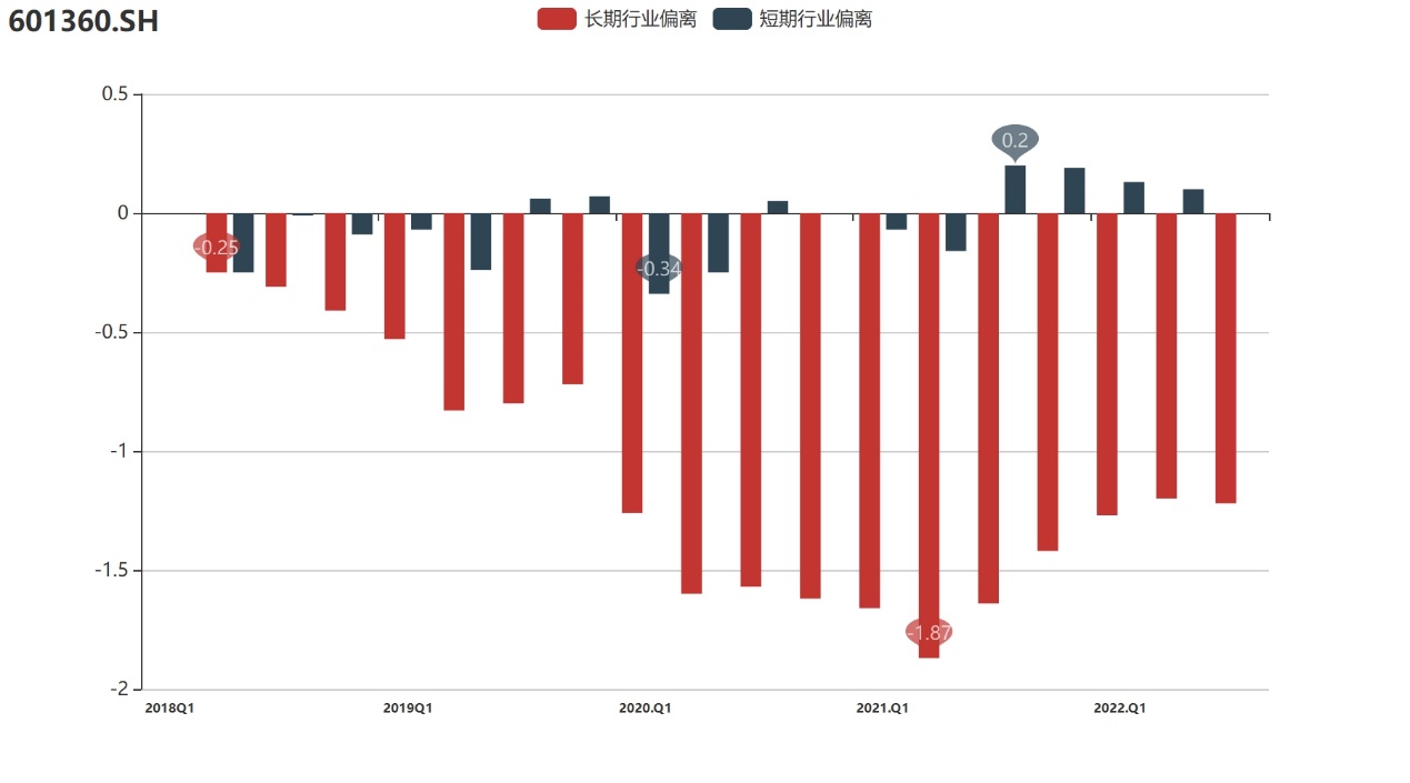 行业偏离:伴随自身溢价协同处于深度低位,三六零的行业偏离也明显扩大。截至2022年3季度,三六零的行业偏离值为-1.22,显著低于行业平均水平。较大的行业差距更加要求公司重视内在价值和市值的协同。
