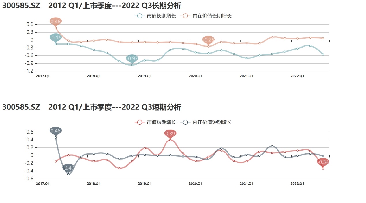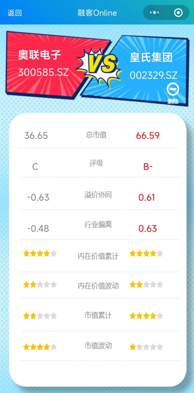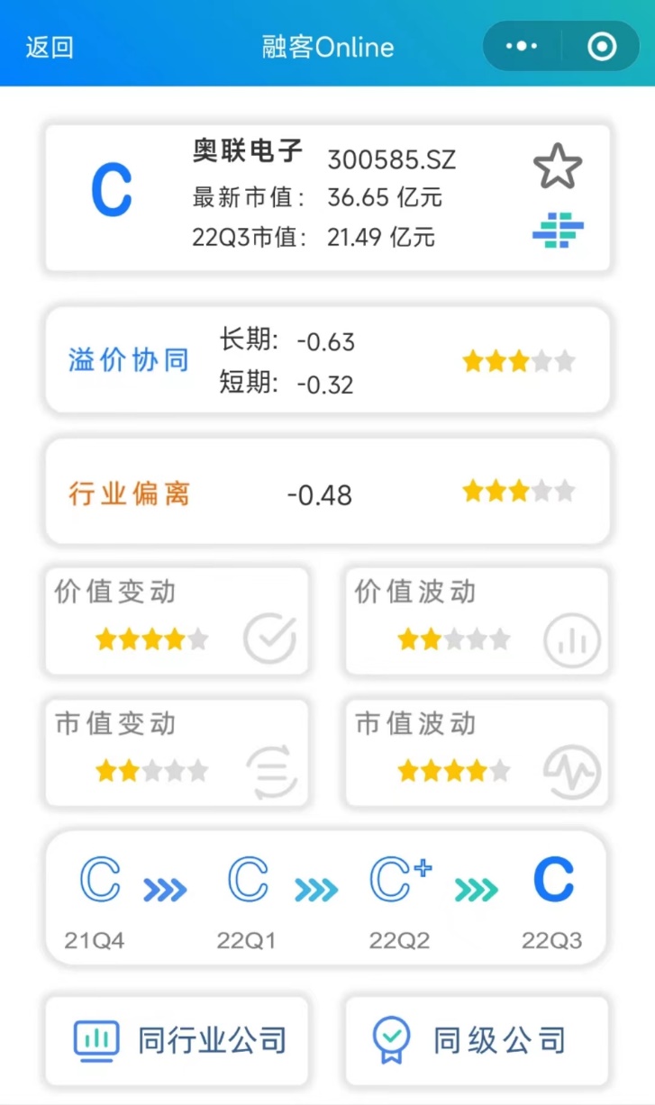 通过【融客Online】小程序对奥联电子打分可以看到,截止到2022年3季度,公司评级为C,健康水平较差。2016年12月登陆创业板以来,公司内在价值累计微增但市值出现下跌,市值没能较好地体现其内在价值。