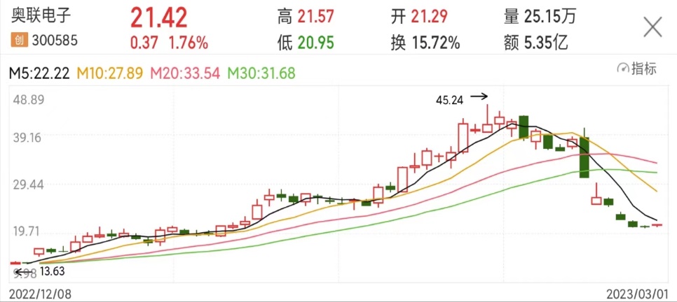 2月23日,市场没能等来奥联电子对相关事项的具体回复,证监会对公司涉嫌信息披露违法违规立案调查的消息已先一步赶到,奥联电子也成为全面注册制实施后遭到证监会立案调查的首家公司。短短几日,公司股价几近腰斩,并且这场“履历门”风波的影响还在持续,公司估值或进一步承压。
