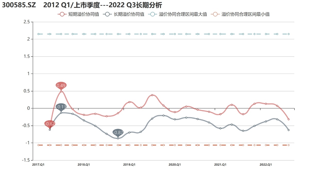 溢价协同值:上市六年多来,公司发展没能收获市场认可,溢价协同始终处于低位,长期更是无一正值。截至2022年3季度,奥联电子长期溢价协同值为-0.63,短期值为-0.32,下滑势头再现。去年年底,奥联电子成为两市钙钛矿领域的明星股,大涨行情下四季度溢价协同有望短暂修复,但如今公司深陷舆论漩涡,股价连续重挫,过去两个月的努力或付之一炬。