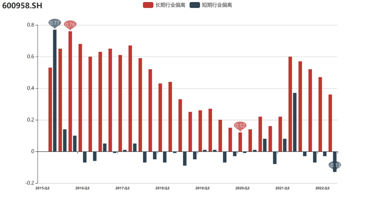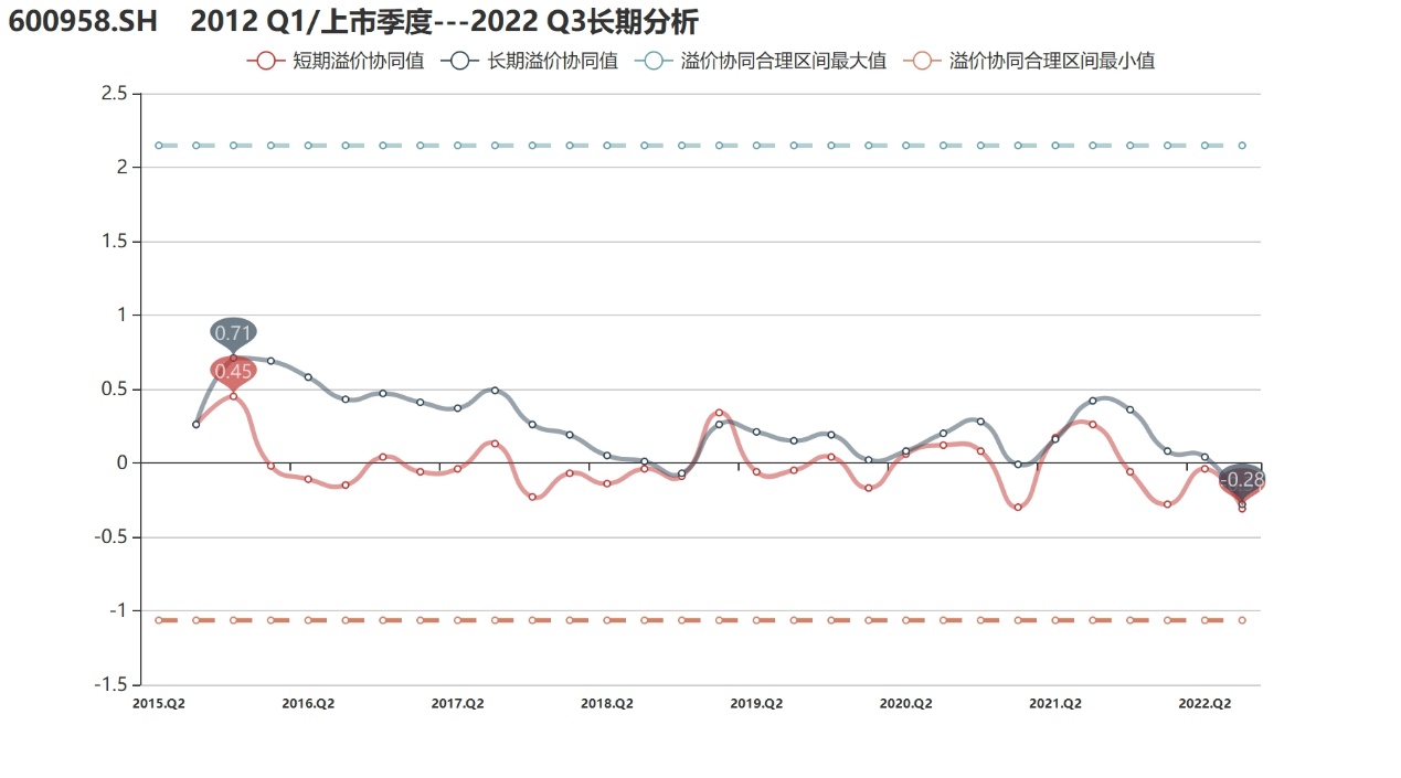行业偏离:在与同行业公司的横向对比中发现,东方证券长期溢价协同明显优于行业平均,也与其溢价协同走势相一致。值得注意的是,2021年公司行业偏离反弹幅度明显,反映出公司在近一段时期市值与内在价值的协同增长情况较好,尽管在2022年有所回调,但仍符合公司在1年期内的良好评价。