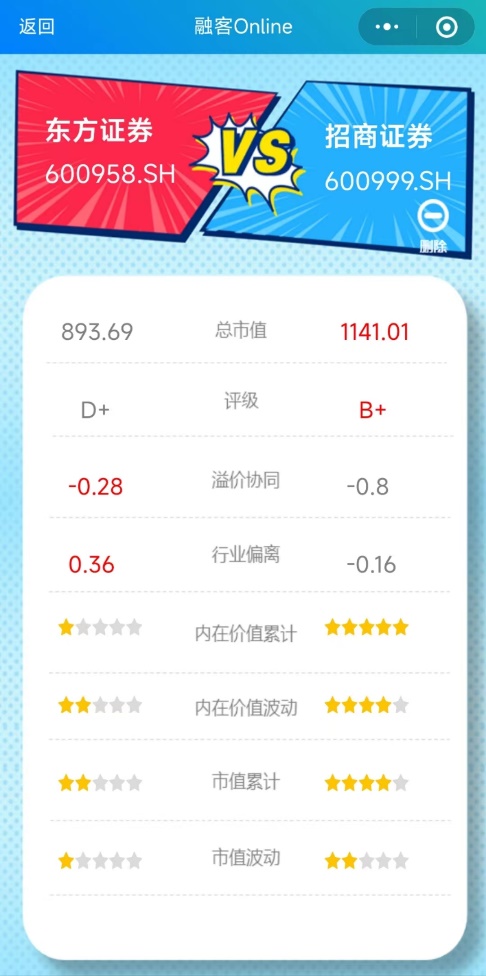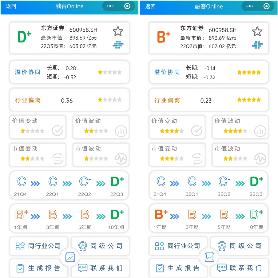 受高基数影响,东方证券上市以来的价值端和市值端评价较差,其中价值变动和价值波动分别为1星和2星,市值变动和市值波动则分别为2星和1星。