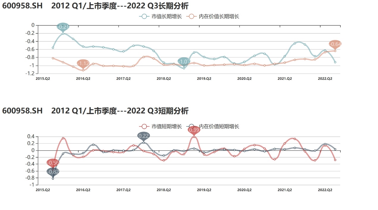通过【融客Online】小程序对东方证券打分可以看到,从2015年2季度到2022年3季度,东方证券的评级为D+,健康水平不佳,长期溢价协同处合理区间小于零,内在价值和市值均累计下跌。