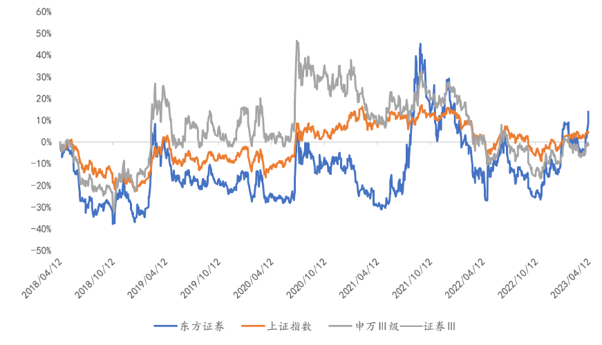 回顾东方证券近五年在二级市场的表现,多数时期与行业板块走势一致,具有明显急涨缓跌的周期性,同时反映了大盘表现强弱。整体上看,东方证券市值表现要弱于行业和大盘。
