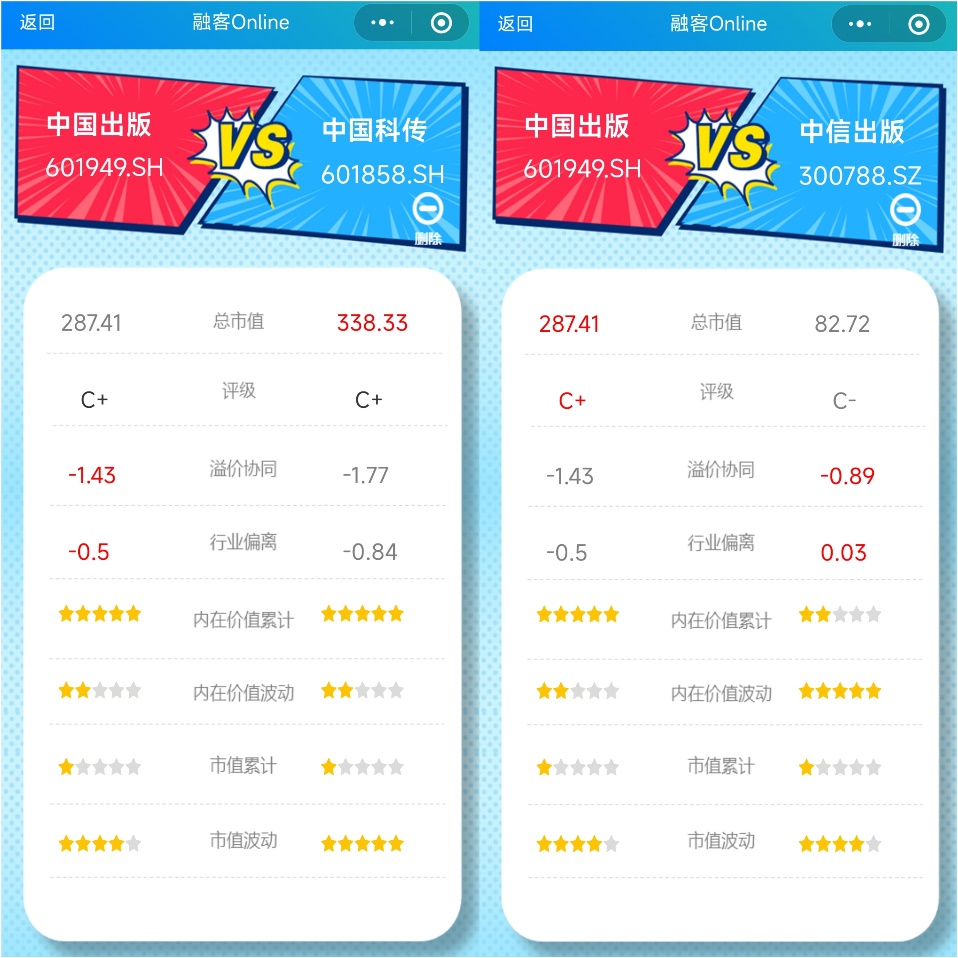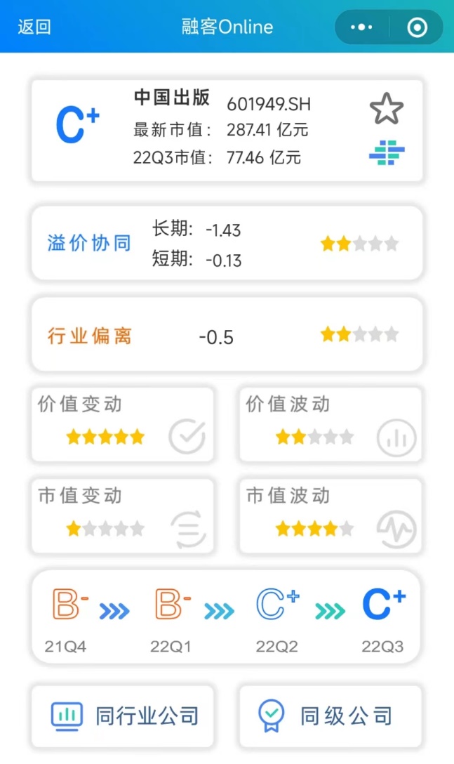通过【融客Online】小程序对中国出版打分可以看到,自2017年Q3上市至2022年Q3的五年间,公司评级仅为C+,且近几个季度有下滑趋势,健康状况并不理想,长期溢价协同已跌出合理区间,市值未能较好体现其内在价值。