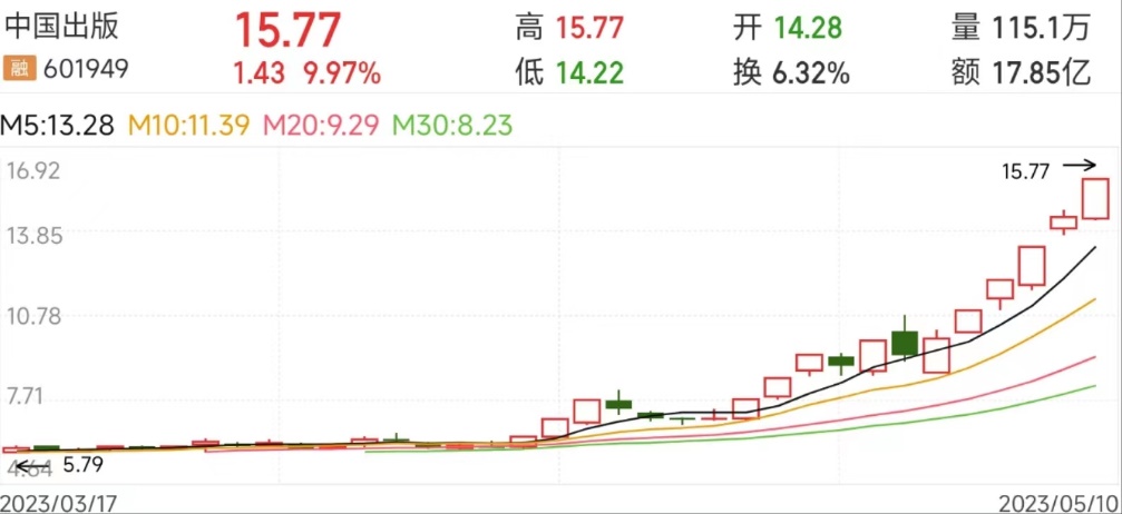 5月10日,大盘全天震荡分化,受“中字头”集体调整影响,沪指跌超1%,但数字经济方向部分个股仍表现强势,其中中国高科、中油资本、视觉中国涨停、中国出版12天8板。截至当日收盘,中国出版收盘价达15.77元,总市值287.4亿元,均创历史新高。