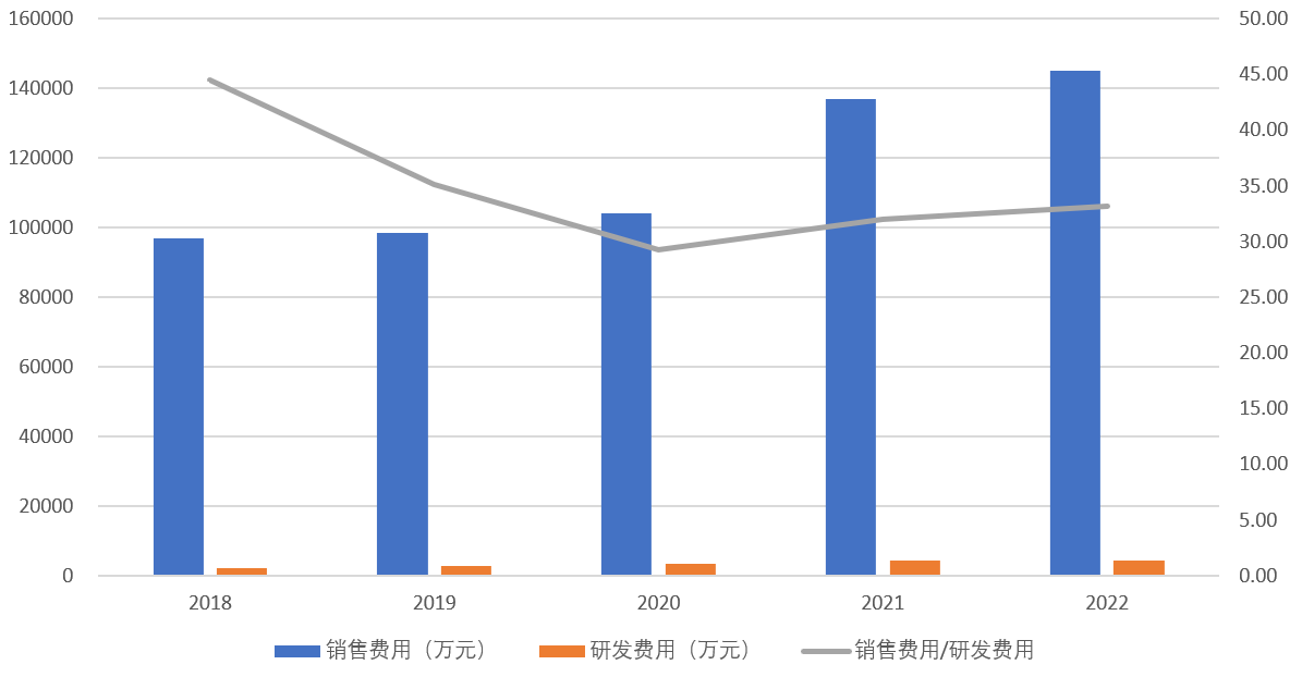 诚然,东鹏饮料正是通过对东鹏特饮这一拳头产品的市场推广和广告宣传砸开了市场,但时至今日,公司依然在走“重营销轻研发”的模式,在能量饮料市场增长日渐放缓的当下有些站不住脚。2018年到2022年,公司销售费用由9.69亿元增长至14.49亿元,而同期的研发费用仅从0.22亿元增加到0.44亿元。缺乏足够的研发支持,重金宣传对于公司产品矩阵及第二爆款的打造显得本末倒置。