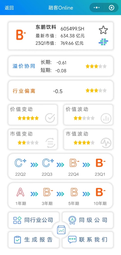 数据显示,东鹏饮料登陆资本市场两年来的评级为B-,健康状况一般,长期溢价协同仅为-0.61,市值没能很好反映公司的内在价值表现。伴随去年年底以来大盘的回暖,东鹏饮料近两个季度的市场表现也企稳回升,1年期评级升至A。