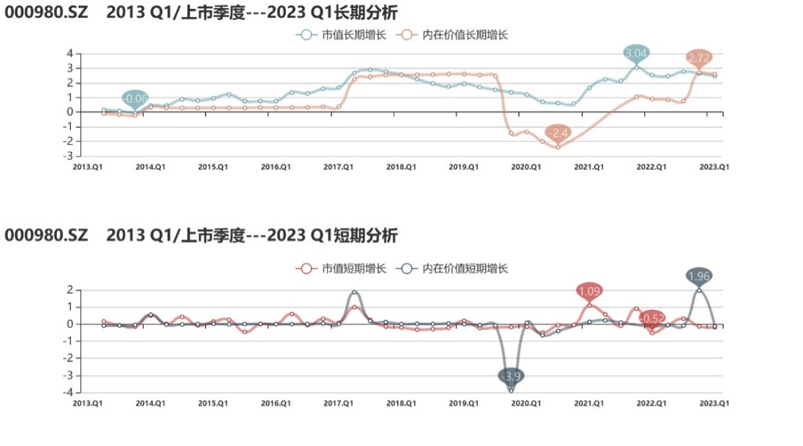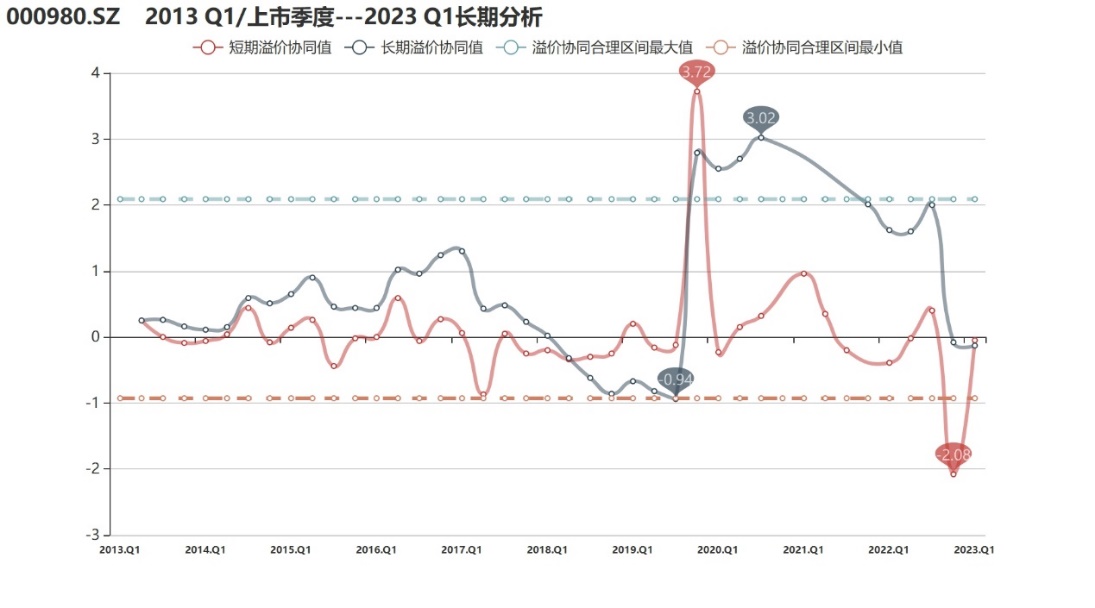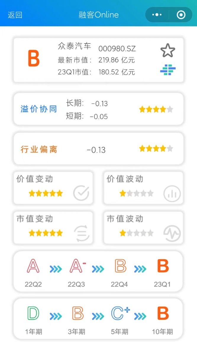 打开小程序,进入众泰汽车的公司界面,可以看到截至2023年Q1的数据情况。数据显示,众泰汽车近十年的评级为B,长期溢价协同(市值变化-内在价值变化)为-0.13,其市值与内在价值实现累计增长但表现极不稳定。