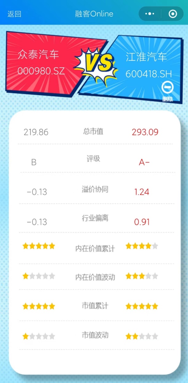 下面我们使用【融客Online】小程序将众泰汽车与江淮汽车进行比较。截至今年Q1,江淮汽车的健康评级为A-,近十年长期溢价协同高达1.24。2020年以来,传统车企积极拥抱新能源转型,彻底改变了资本市场的态度,进而大幅推动了传统车企的股价和市值,江淮汽车也在这波新能源行情中创下新高。