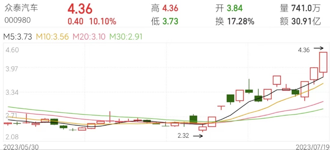 不过相较于上述绩优股,基本面岌岌可危的众泰汽车却成为了整车板块中的 “香饽饽”。7月以来,其股价涨幅已超70%,除了13天7板的行情,其走势大开大合、大涨与大跌相互穿插、“进二退一”的极端表现也被投资者冠以“妖股”称号。股价大幅波动的背后,自然与众泰汽车频繁的大动作有关。