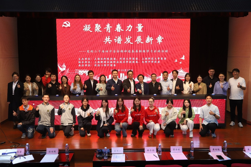 10月30日,由上海社会科学院团委、同济大学团委与上海师范大学团委主办,上海新闻出版职业技术学校团委、光明中学团委协办,同济大学第二附属中学团委承办的“凝聚青春力量 共谱发展新章——党的二十届四中全会精神进基层联组学习”首场启动仪式在同济二附中举行。团市委宣传与网络工作部、学校工作部代表出席活动。